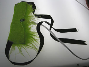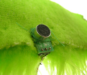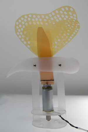 Catherine Sings a Duet with Karaoke Butterfly. Concept: We wished to create a natural, visual interface for a singer to be able to express themselves. During a performance, someone out of earshot, or not able to hear, could still have a sense of the performer's vocal expression. ![]() Early concept drawing Process: Our original implementation was to use muscle wire to pull on the wings and cause natural looking open-and-close movement. ![]() Early implementation drawing However, even though muscle wires were very effective, they ran too hot and melted our plastic base. And set our insulating materials on fire. We eventually settled on first a pull solenoid, and when that didn't work, a push solenoid, to power the system. A stepper motor was also set up as a backup plan. Inputs were tested with Photocells, and later with a microphone/amp chip. It is attached to a choker to pick up sound waves directly off of the neck. A melted base with muscle wire An early green butterfly model with a pull solenoid Final model, with a push Solenoid, set to a random flap generator
